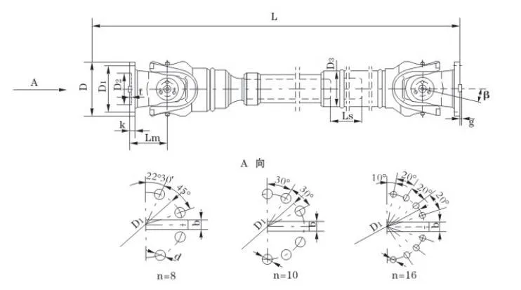 | Οχι. | Διάμετρος περιστροφής D mm | Ονομαστική ροπή Tn KN·m | Γωνία αναδίπλωσης αξόνων β (°) | Κουρασμένη ροπή Tf KN·m | Flex ποσότητα Ls mm | Μέγεθος (mm) | Περιστροφική αδράνεια kg.m2 | Βάρος (kg) | |||||||||||